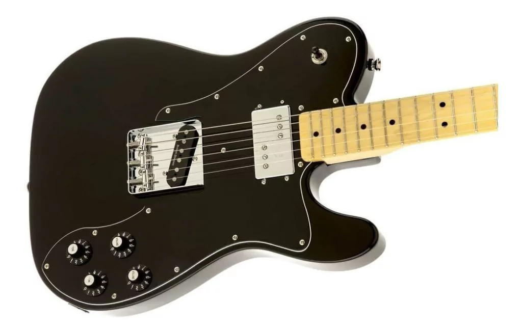 negro, cambio de pastilla de tres vias, cuatro perillas de amplificador con faldon negro (dos volumenes, dos