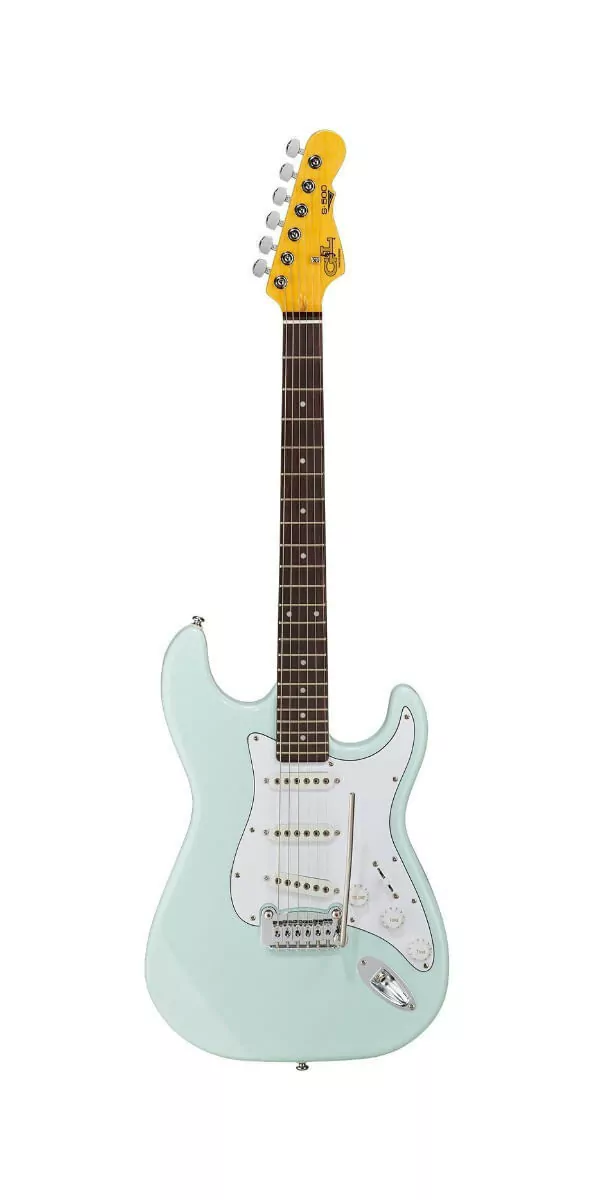 -Color: Sonic Blue sobre cuerpo de caoba, batidor blanco de 3 capas, acabado en cuello tintado, diapason de cerezo brasileno