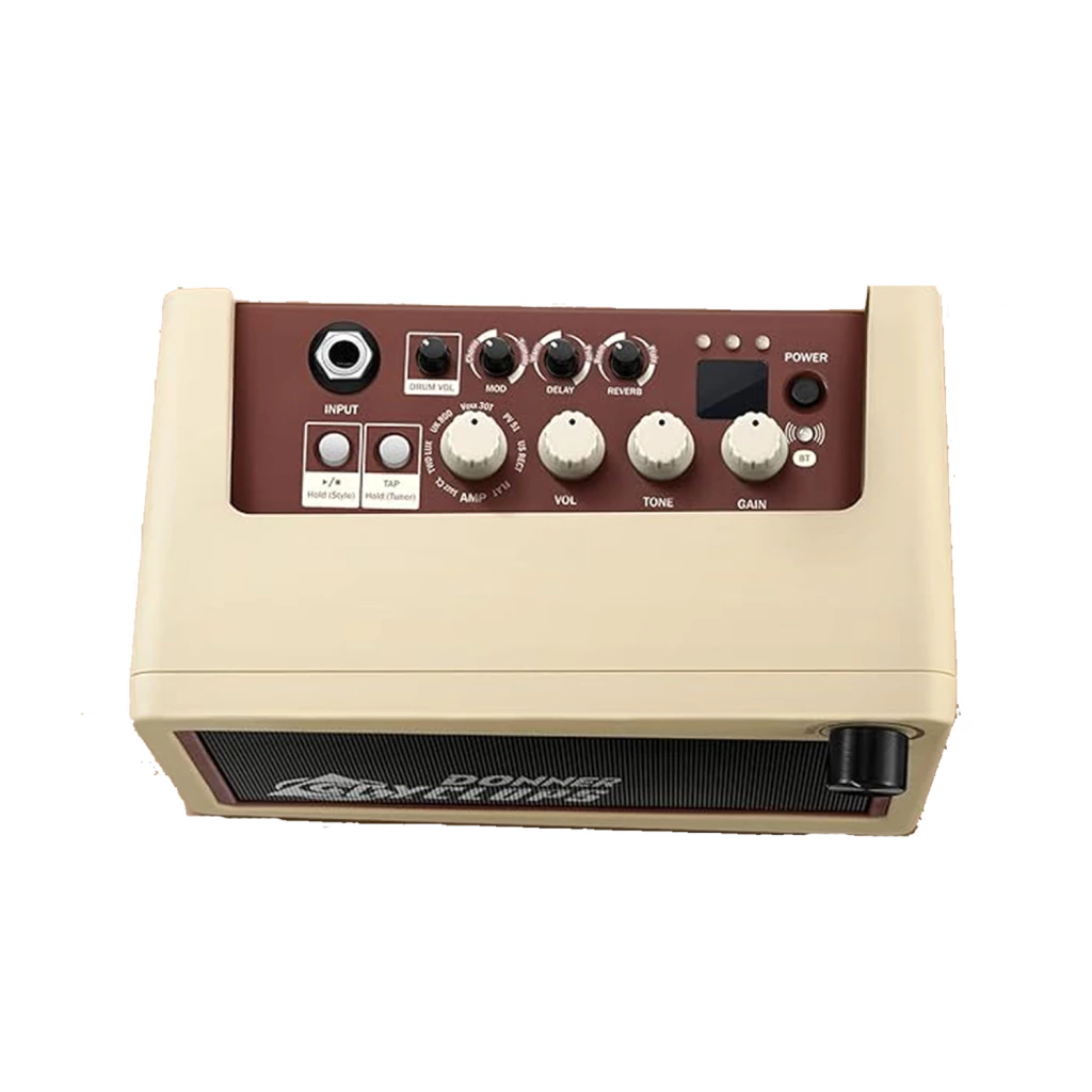 Amplificador De Guitarra Portátil Donner Cyclops Bluetooth Con Batería 7 Presets 3 Efectos 40 Ritmos Amplificador portátil Donner Cyclops, ideal para practicar en casa, transportar con facilidad y disfrutar de un sonido versátil en cualquier momento. Su diseño retro y tamaño compacto lo convierten en una opción práctica para guitarristas de todos los niveles. Incluye conexión Bluetooth para reproducir música, 7 presets de amplificador, 3 efectos integrados y 40 ritmos de batería que permiten practicar sin necesidad de equipo adicional. Cuenta con controles independientes de volumen, tono y ganancia, además de perillas dedicadas para modulación, delay y reverb. Su interfaz es sencilla y accesible, con entradas Aux In, USB y salida de auriculares. Funciona con alimentación de 9V o por batería para usar en cualquier lugar.